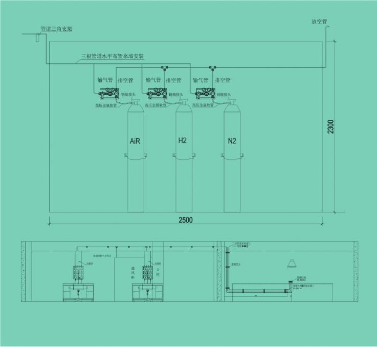 實(shí)驗(yàn)室用氣主要有不燃?xì)怏w(氮?dú)狻⒍趸迹?、惰性氣體(氬氣,氦氣等)、易燃?xì)怏w(氫氣、一氧化碳)、劇毒氣體〔氟氣、氯氣)及助燃?xì)怏w(氧氣)組成,可以通過(guò)輸氣管接到各實(shí)驗(yàn)室內(nèi),一般氣相室配置氦氣(He)、氮?dú)猓∟2)。氣質(zhì)聯(lián)用室配置氮?dú)?,氯氣、氧氣。所有管線在安裝完畢后一定要做氣密性實(shí)驗(yàn),嚴(yán)禁有泄露的可能。由于管道細(xì)小,管間距小,安裝過(guò)程中可依據(jù)現(xiàn)場(chǎng)情況進(jìn)行凋整,氣瓶裝柜時(shí),易燃易爆與惰性氣體同柜,杜絕兩種易燃?xì)怏w氣瓶同柜。