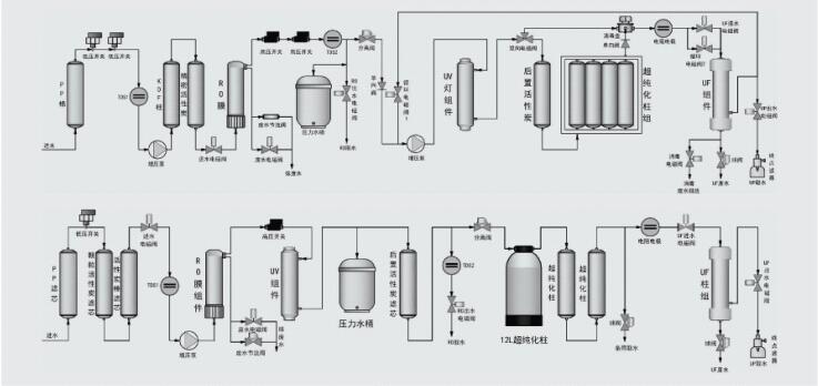 3、采用EDI方式,其流程如下:實驗室超純水系統(tǒng),超純水設(shè)備 原水→原水加壓泵→多介質(zhì)過濾器→活性炭過濾器→軟水器→精密過濾器→一級反滲透機(jī)→中間水箱→中間水泵→EDI系統(tǒng)→微孔過濾器→用水點。