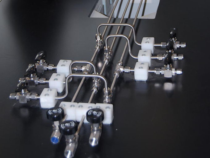 環(huán)境檢測(cè)實(shí)驗(yàn)室用氣主要有不燃?xì)怏w(氮?dú)?、二氧化碳)、惰性氣體(氬氣、氦氣等)、易燃?xì)怏w(氫氣、一氧化碳)、助燃?xì)怏w(氧氣)組成。除不燃?xì)怏w、惰性氣體外其他氣體不進(jìn)入實(shí)驗(yàn)室,通過輸氣管接到各實(shí)驗(yàn)室內(nèi)。一般氣相色譜室配置氦氣、氮?dú)?。氣質(zhì)聯(lián)用室配置了氦氣、氫氣、氧氣。氫氣管線上的連接管件都要連接后焊接,嚴(yán)禁泄漏。所有的管線在安裝完畢后要做氣密性測(cè)試,并在使用前要先除油。由于管道細(xì)小,管間距小,安裝過程中可依據(jù)現(xiàn)場情況進(jìn)行調(diào)整,保證間距不小于45mm,氣瓶裝瓶時(shí),易燃易爆與惰性氣體同柜,不要兩種易燃?xì)馄垦b一柜。